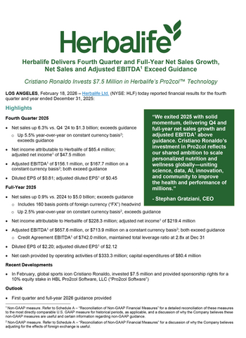 LOS ANGELES--(BUSINESS WIRE)--Herbalife Ltd. (NYSE: HLF) today reported financial results for the fourth quarter and year ended December 31, 2025: